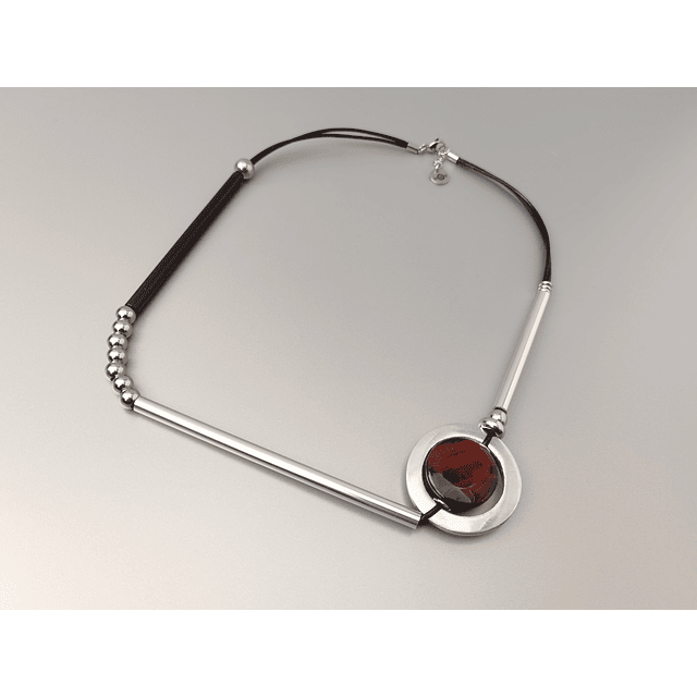 Materiais: tubos de latão, tubos de alumínio, pedras, peças em aço inox e fio de couro cinzento.